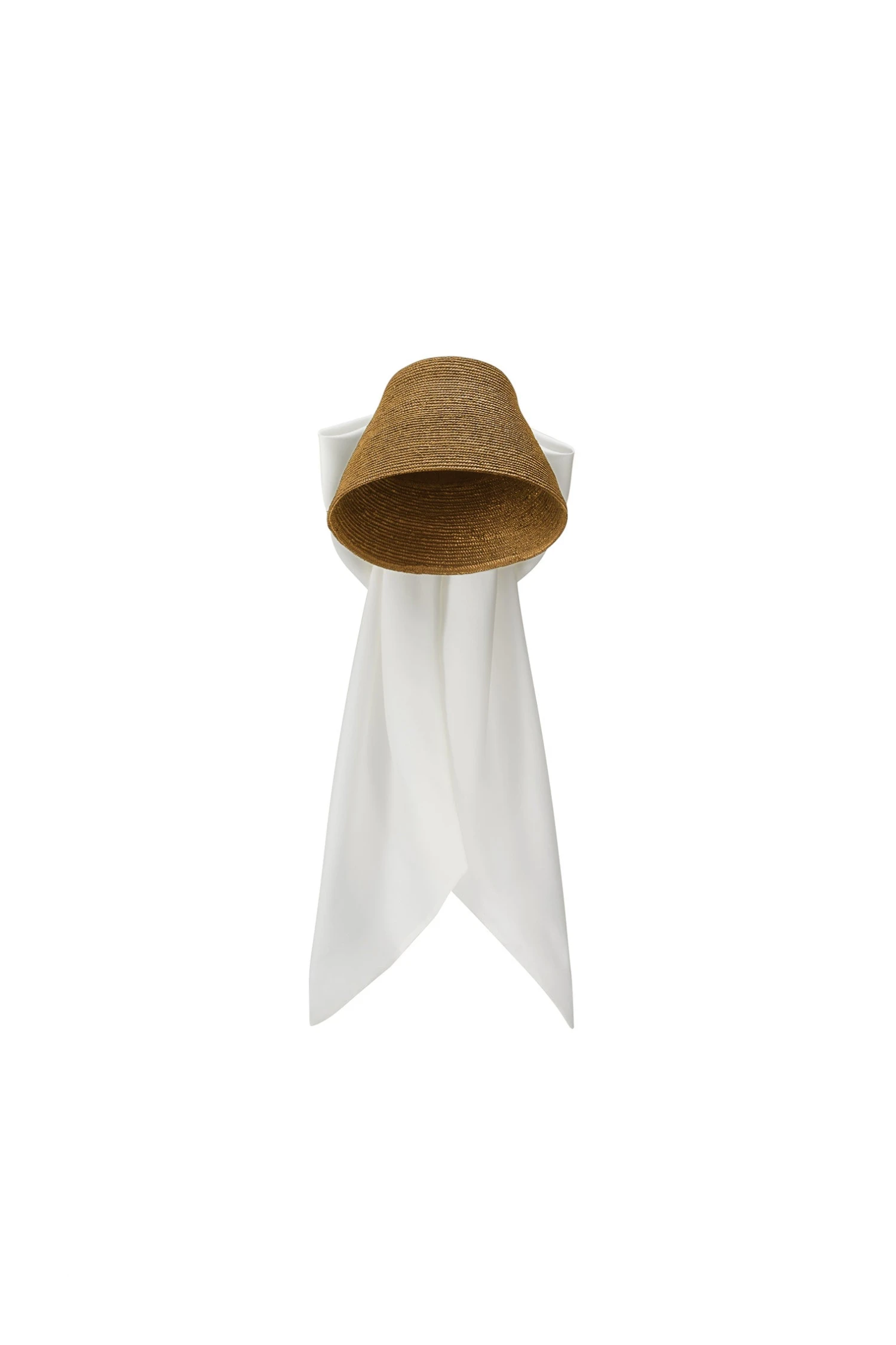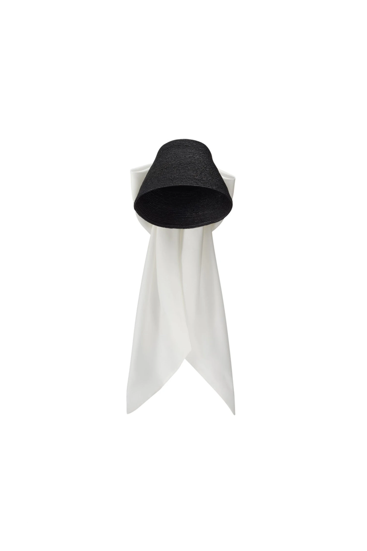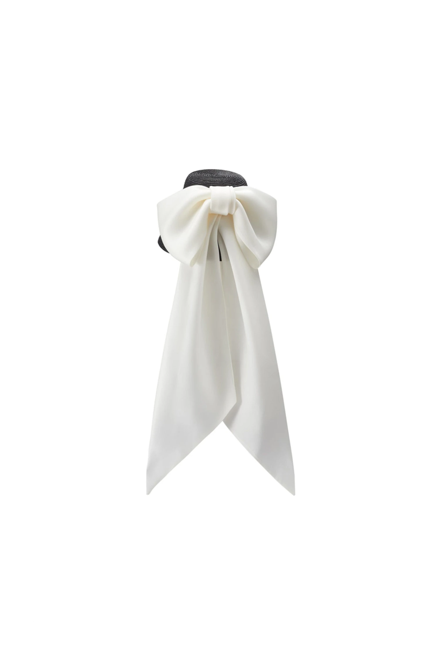 The Emma bucket hat is a stunning couture headpiece crafted from straw braid with an eye-catching oversized rich ivory silk gazar bow on the reverse.