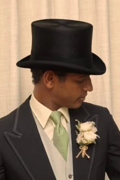 The London top hat is made from luxurious beaver fur felt and has a finer feel than our Mayfair and Westminster (formerly the Town Shell top hat) rabbit-fur toppers. With its dapper silhouette, the London is ideal for formal occasions such as weddings, Royal Ascot, or garden parties. Although the shape is similar to our other toppers, the London has a more tapered crown than the Westminster.