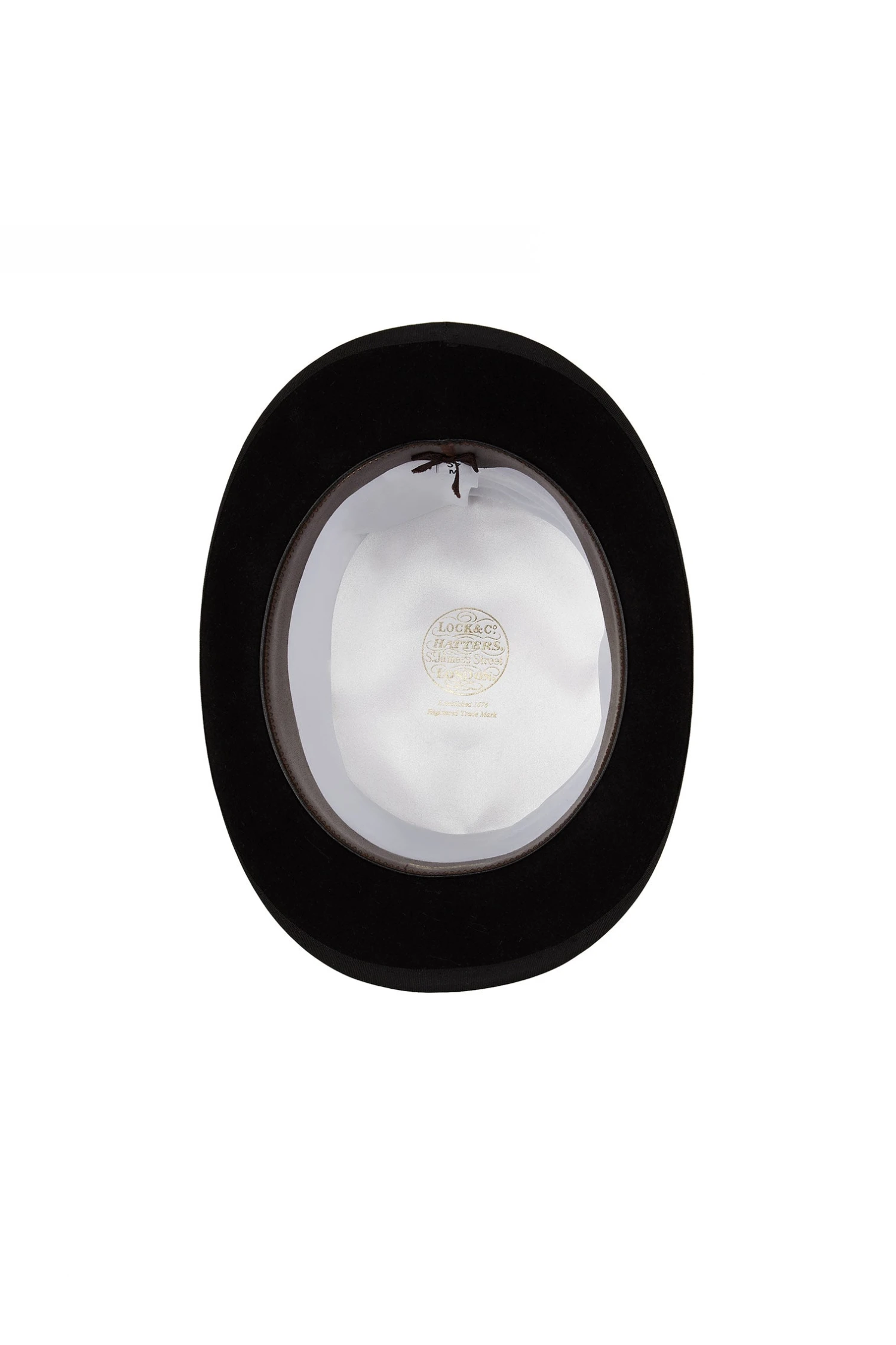 The London is finished with a thin grosgrain band with a bow and, like all our other toppers, is fully satin-lined and has a leather inner sweatband.