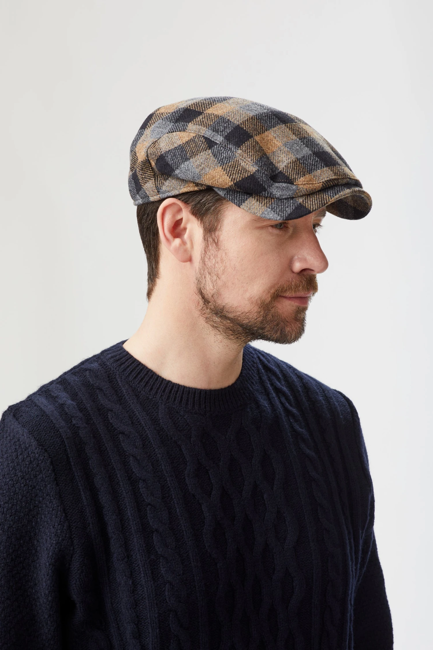 The Lynton beige flat cap is made of 100% wool and has a curved peak.Â