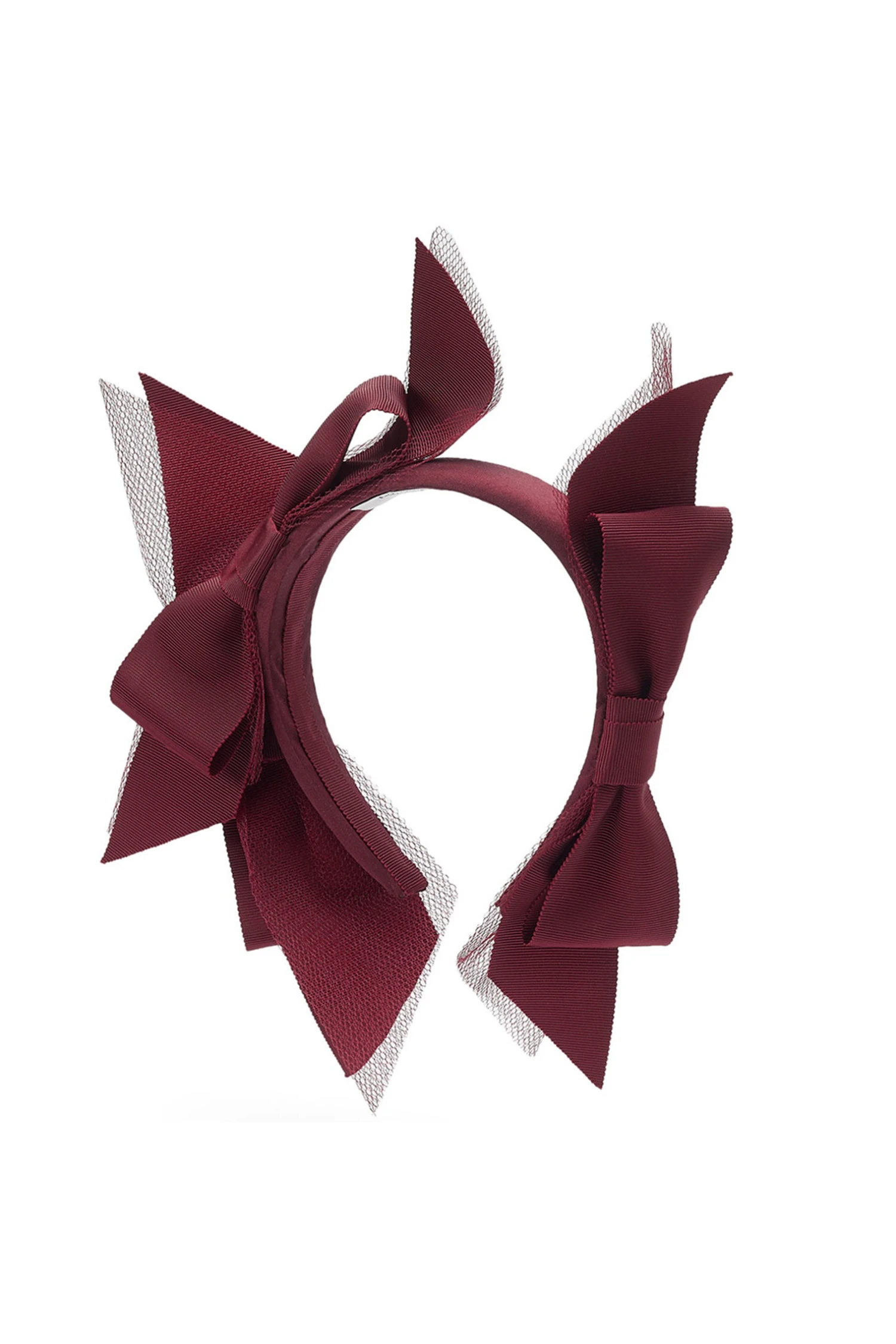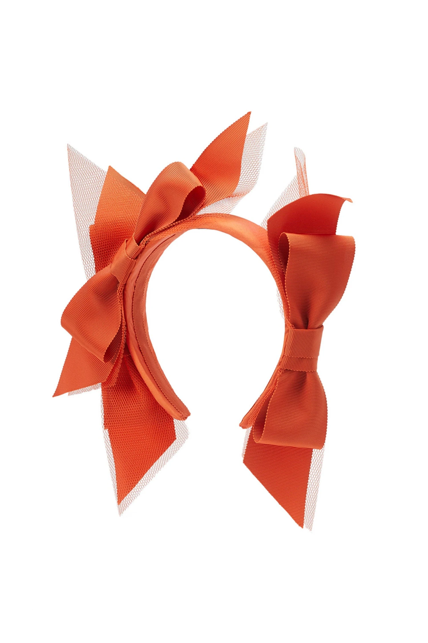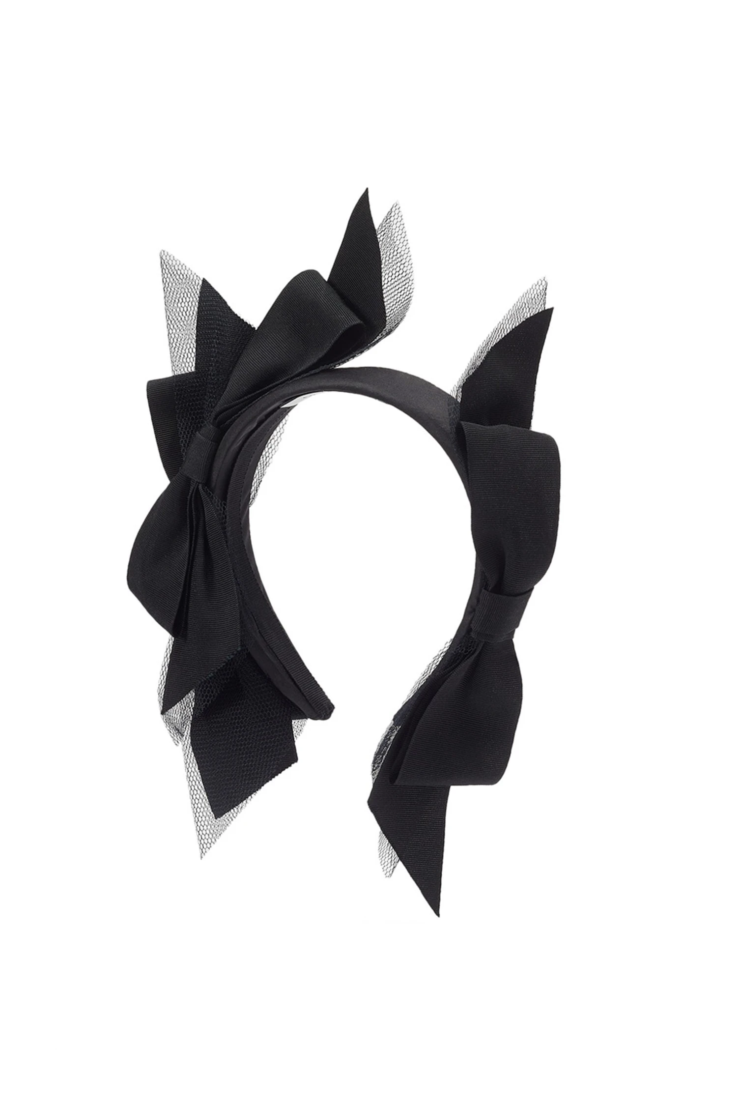 This fun headband features lustrous grosgrain and tulle bows all set on a silk covered headband.