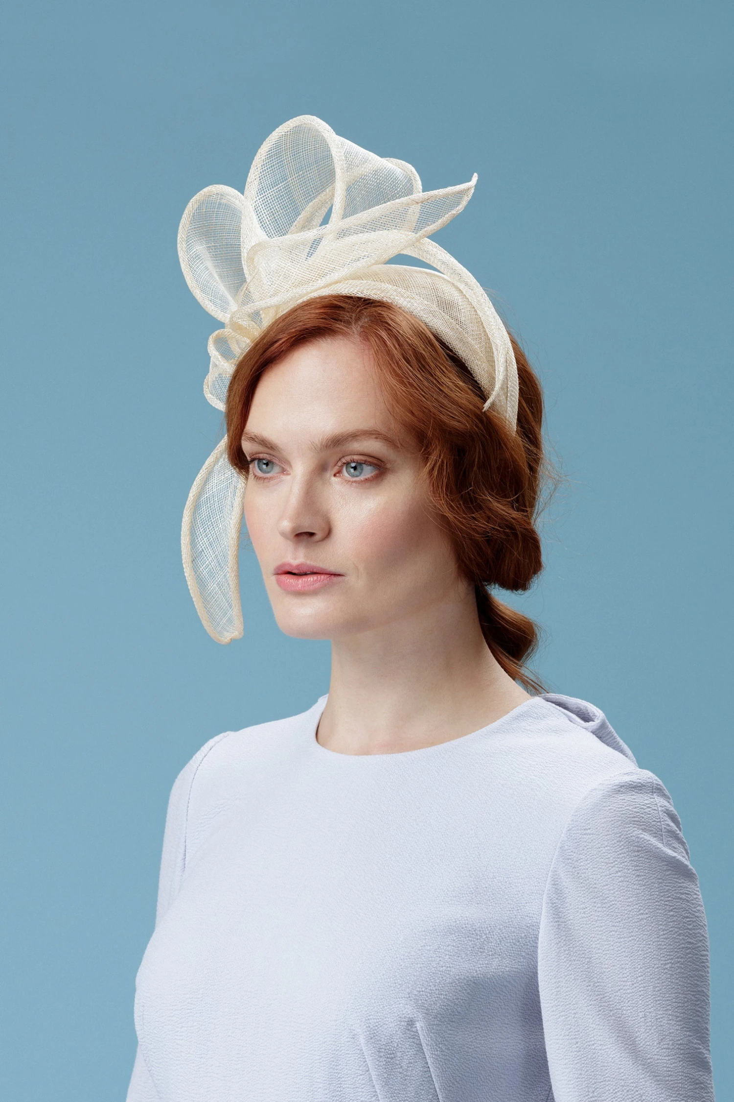 The Rosemary headband is a versatile statement piece featuring swooping sinamay swirls on a wiredbase and headband.