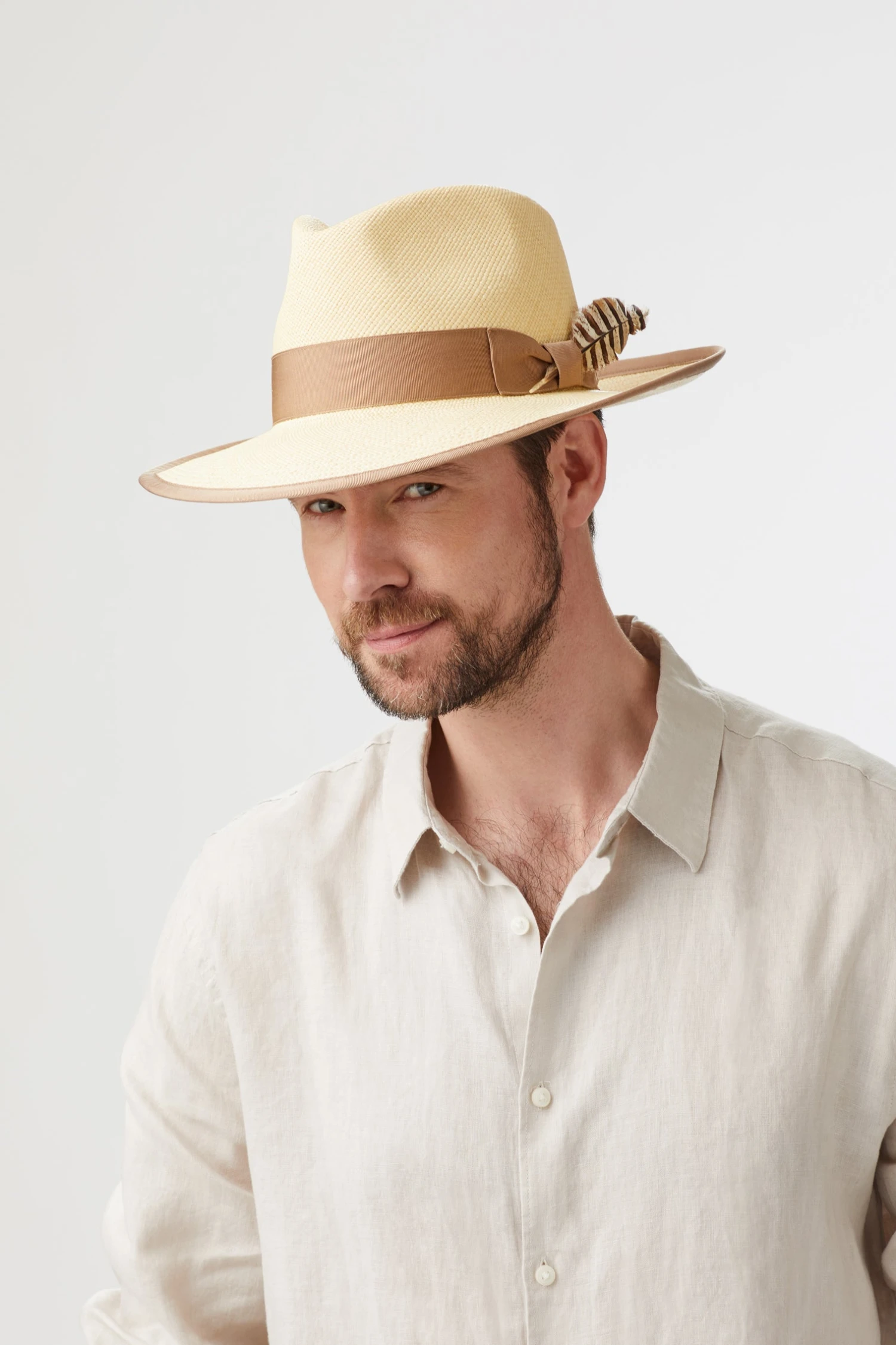 Made from the finest toquilla palm by craftspeople in Ecuador, the San Diego Panama is hand-blocked with a teardrop crown, and a sand-coloured, grosgrain band and bow. A feather finishes the look with a stylish flourish, and the bound edge ensures longevity and shape retention.