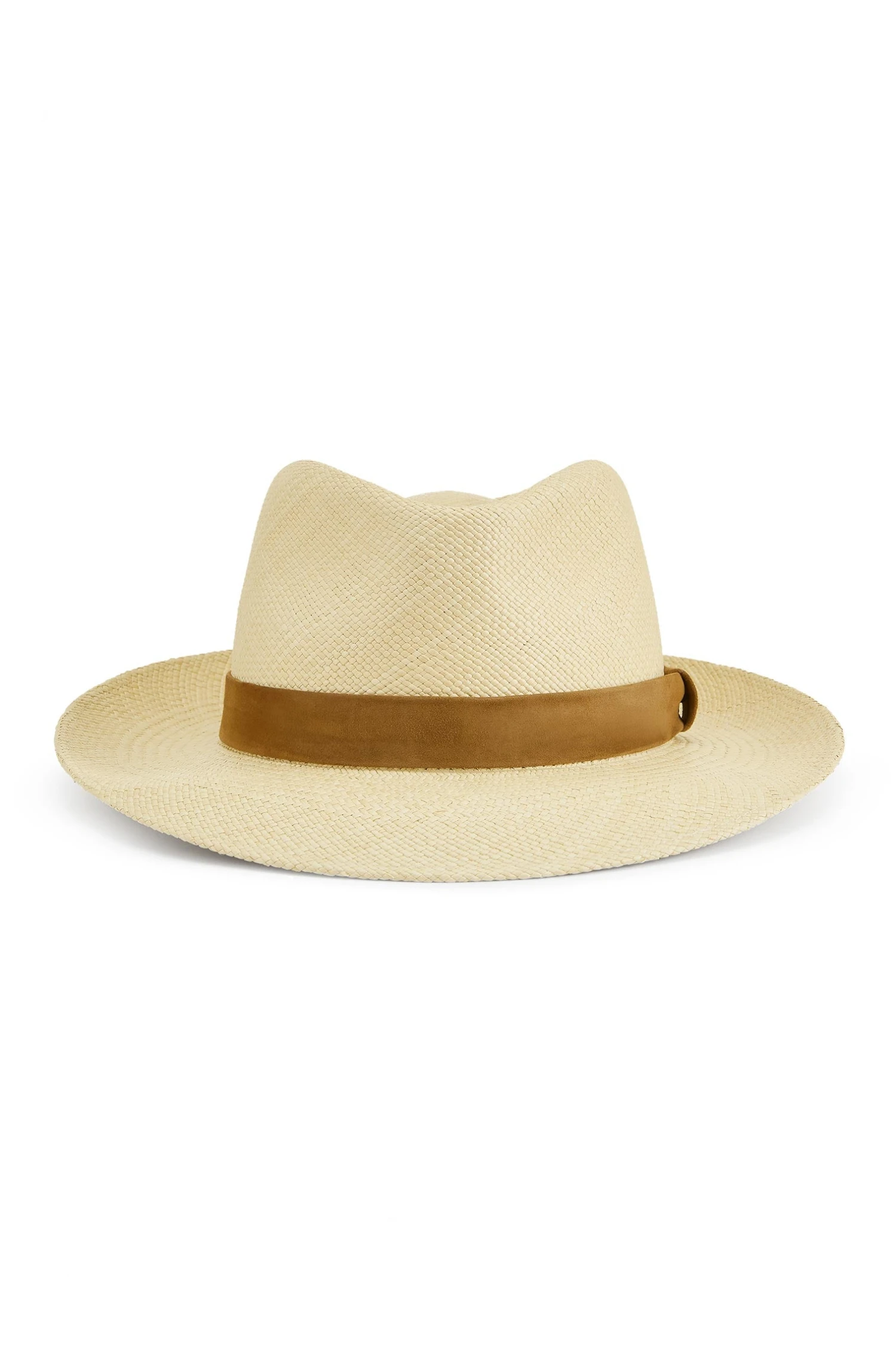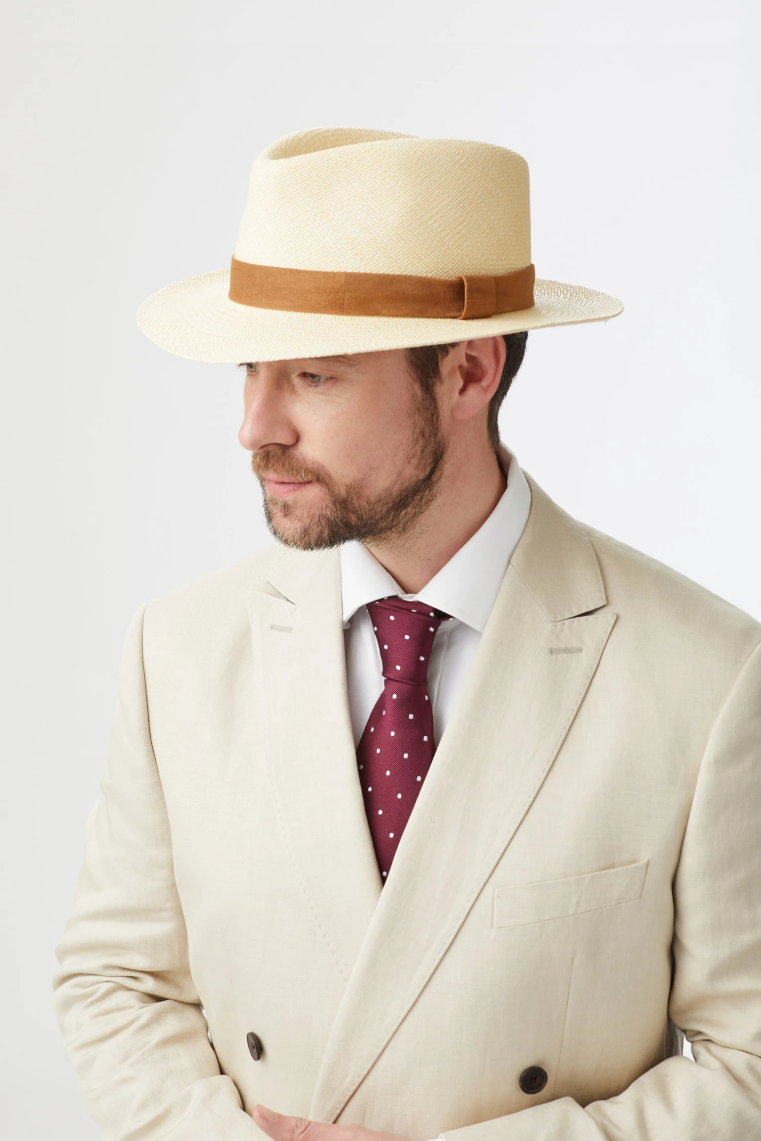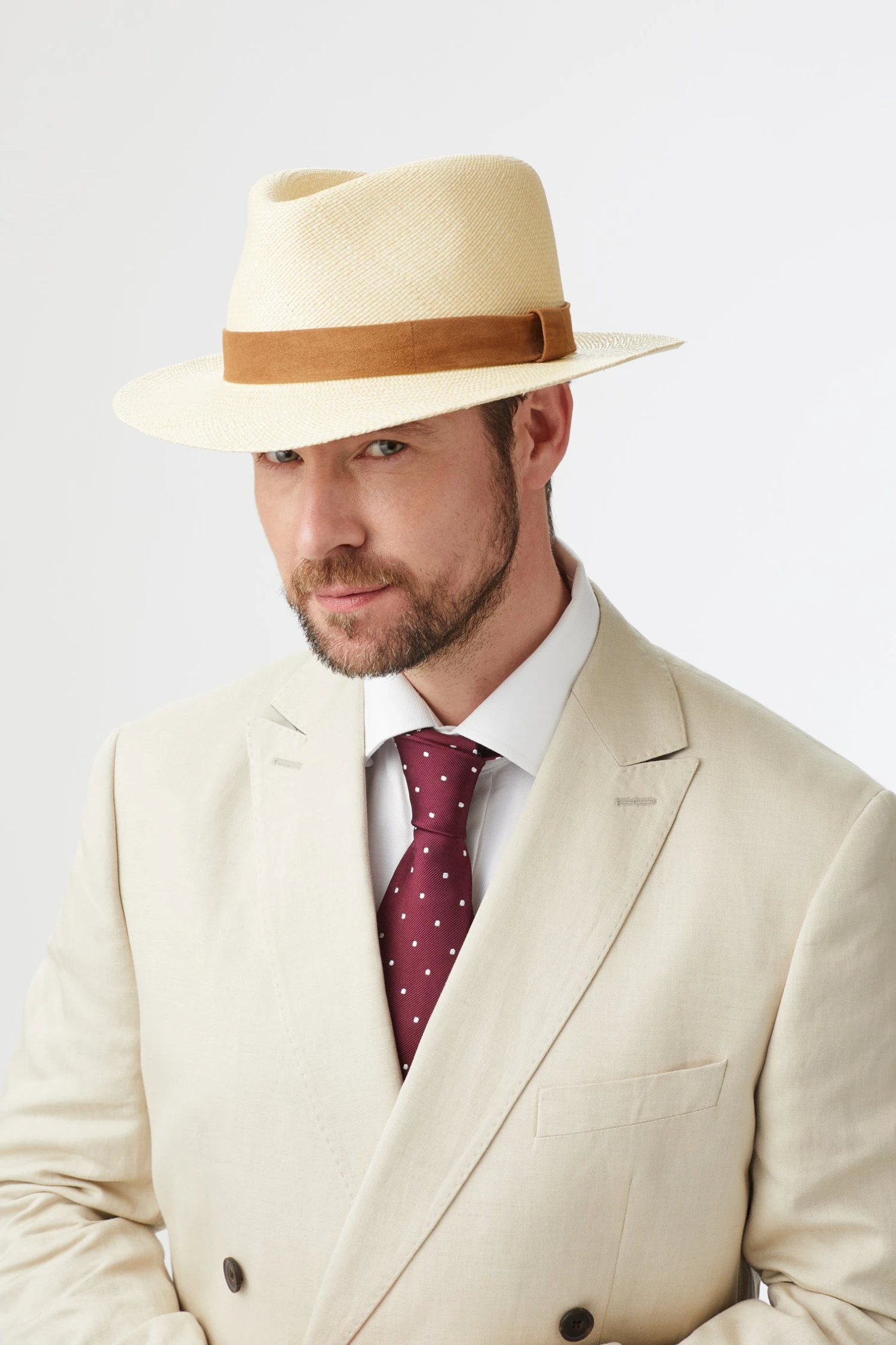 Made from toquilla palm, each piece is unique, and is hand-woven by expert craftspeople in Ecuador. The hat is hand-blocked with a tear-drop crown and finished with a tobacco-brown suede band. The hat features a supple aniline leather sweatband ensuring for a comfortable wear.