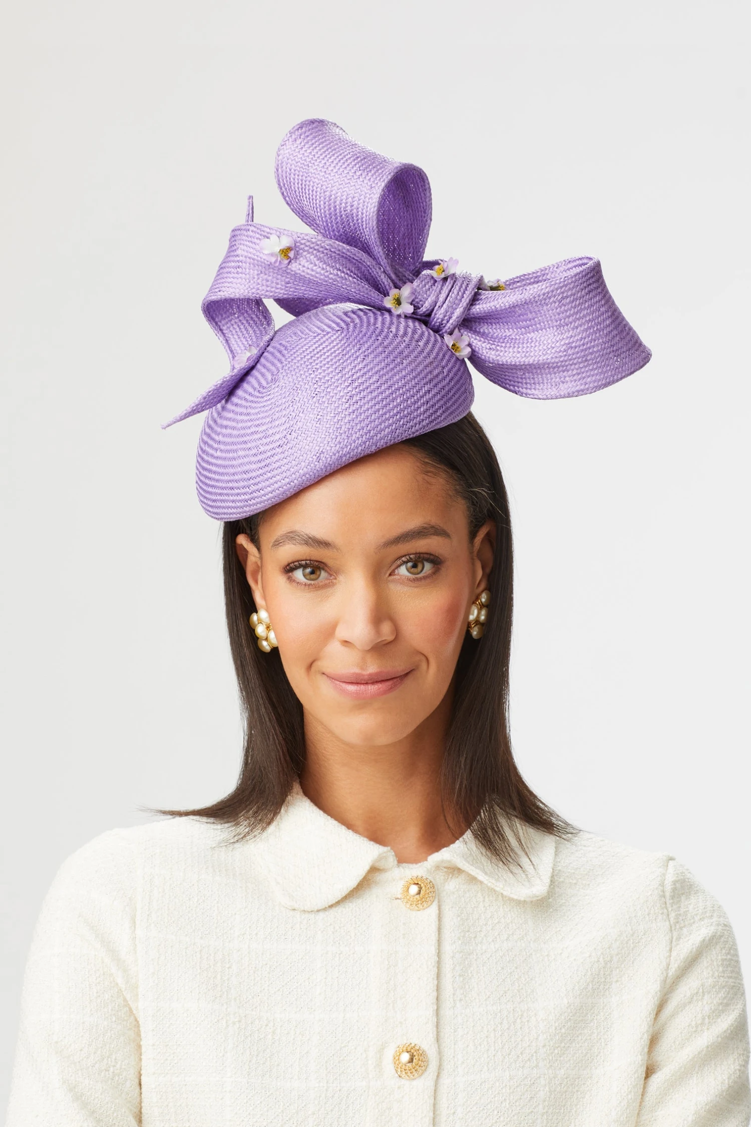 Available in purple, ivory, and pink and crafted from parasisal straw with a hand-shaped bow and mini vintage flower detailing.Â