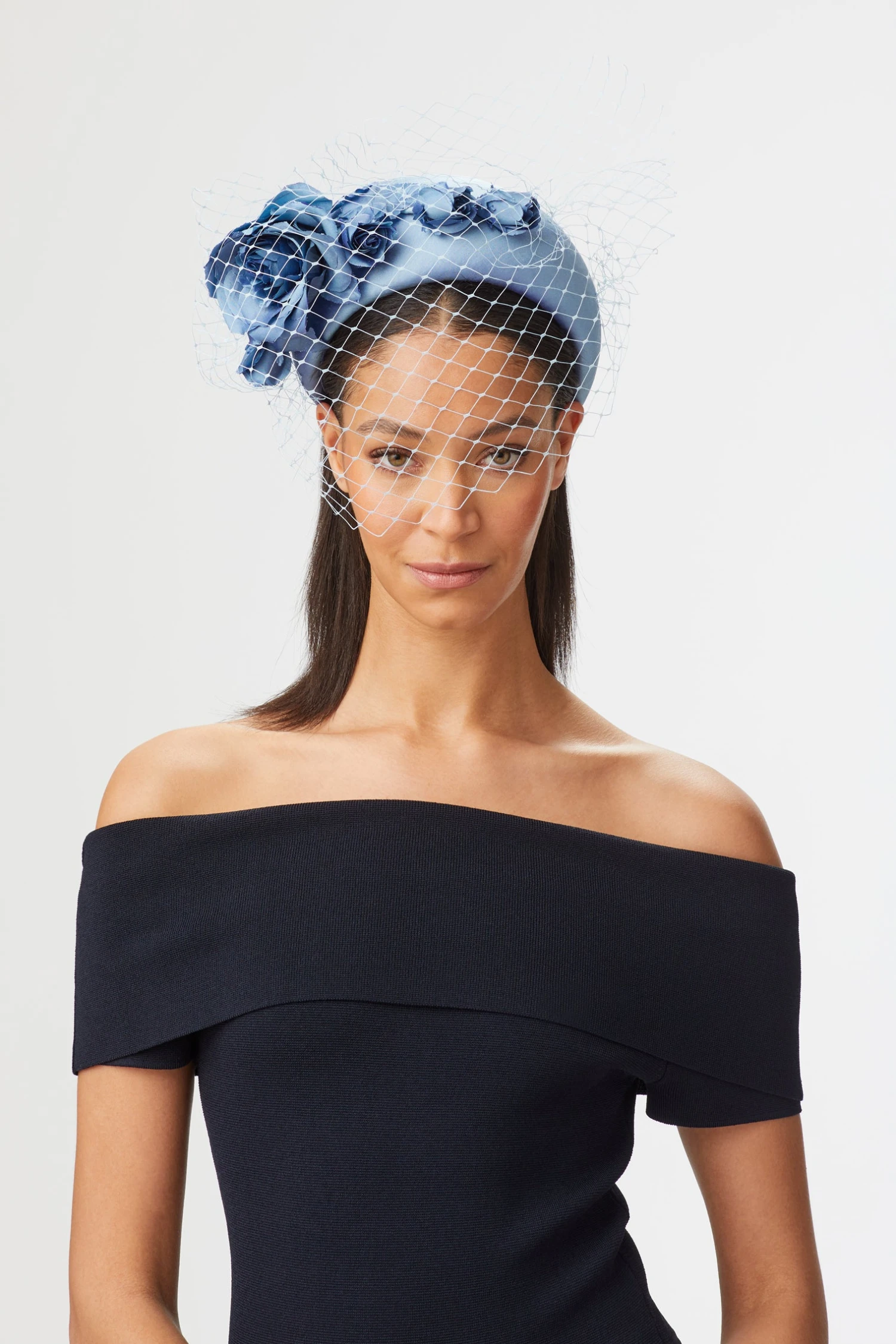 A luxuriously crafted Dupion silk covered blocked headband with matching handmade silk rose spray and draped veiling is available in pink, blue, and silver